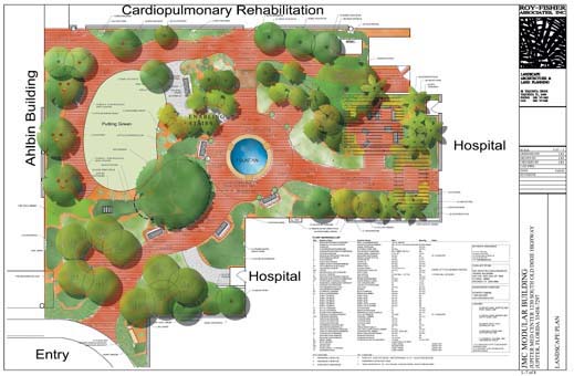 باغ حیاط توسط ساختمانهای بیمارستان احاطه شده است. گیاهان به منظور تامین شکوفایی حیاط و منظر سبز آن انتخاب گشتهاند. یک آبنمای کوچک جهت تقلیل صدای خیابان مجاور، تعداد کثیری نیمکت چوبی و میز و صندلیهای متحرک به چشم میخورند. در طول پروسه طراحی کارگاه آموزشی با حضور بیماران و کارکنان بیمارستان تشکیل یافت. در این کارگاه پیشنهادات متعددی به منظور تامین ملزومات باغ ارائه گردید. حتی داستان نجات برخی از این بیماران روی لوحهای سفالی حک شده و در فضای داخلی مجموعه قرار گرفته است.