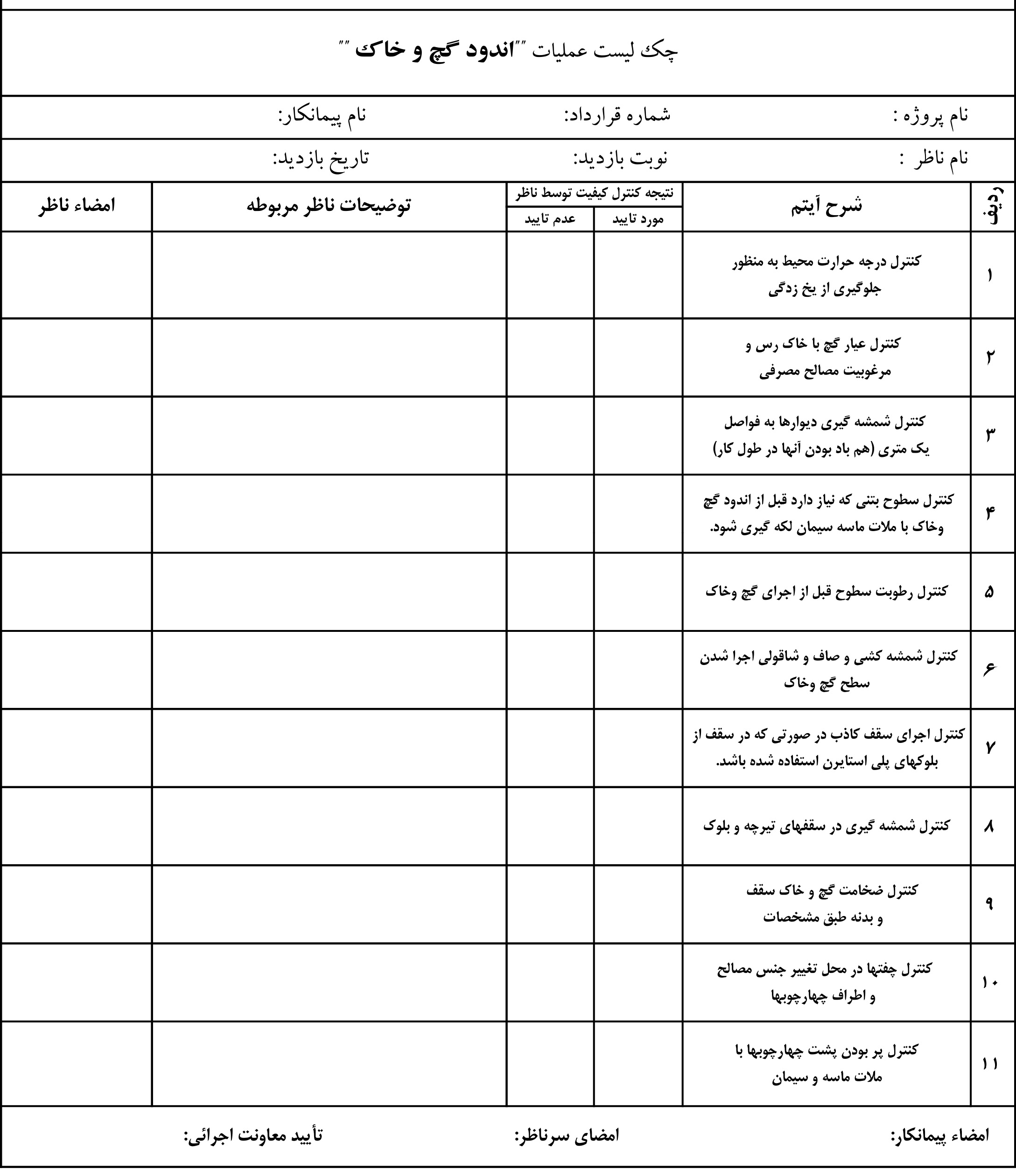 شما با دانلود این چک لیست می توانید گام به گام مراحلاندود گچ و خاک را کنترل و بررسی نمایید.